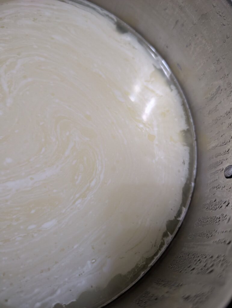 If it needs 7 hours, that’s fine, cottage cheese is forgiving.  This is how it should look in the pot when it’s ready – lots of whey, one solid curd formation that has separated from the sides of the pot.